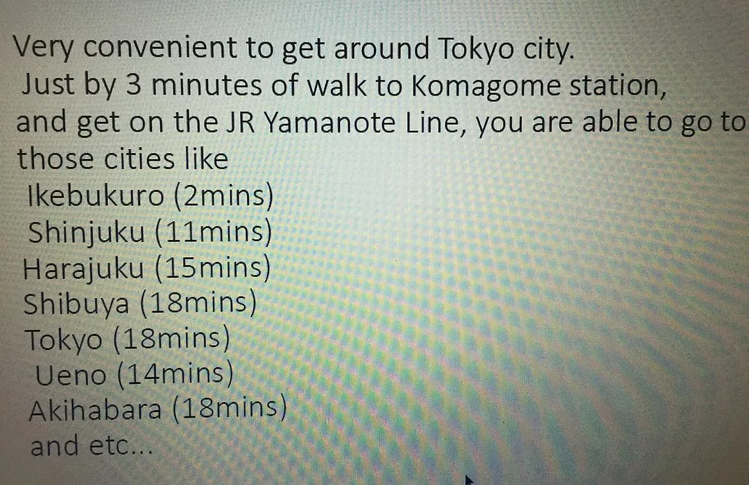 A hostel Tokió Kita körzetében kínál szállást. A hotel a Someiyoshino Sakura Memorial Park közelében helyezkedik el. A Kaburaya Komagome és Hidakaya Komagome East Entrance ízletes finomságokkal várják vendégeiket 300 méter távolságra. A Komagome hely metrómegálló 550 méterre található az ingatlantól.